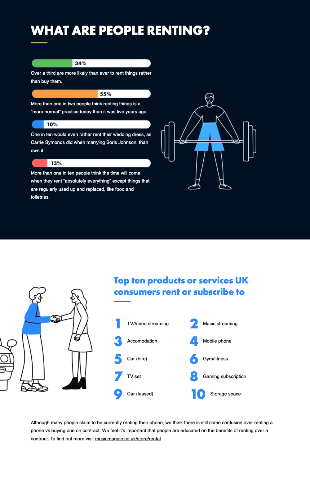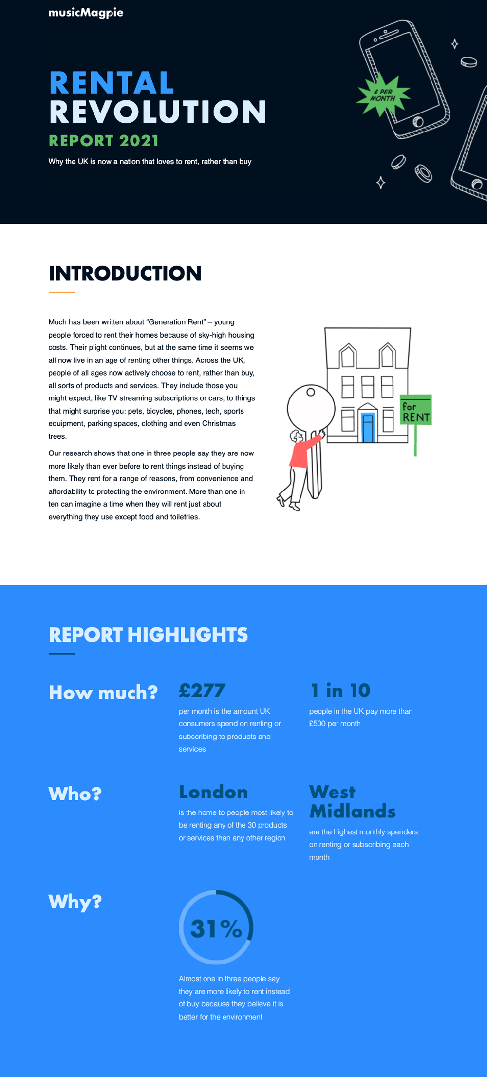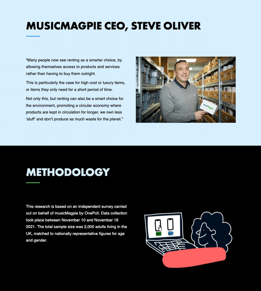 MusicMagpie, working with our sister agency 72Point, commissioned OnePoll to create the Rental Revolution report which aims to find out why the UK is now a nation that loves to rent, rather than buy. The report was to be digital only with our sister design agency Oath creating a one page interactive website with custom illustrations and responsive layout.